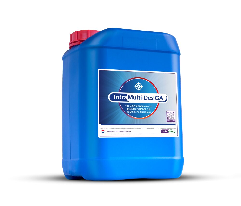 Intra Multi-Des GA – дезинфицирующее средство на основе глутарового альдегида и четвертичных аммониевых соединений. Продукт содержит регистрацию биоцида для дезинфекции поверхностей и регистрацию биоцида для борьбы с водорослями. Intra Multi-Des GA устраняет водоросли, повреждая и прорывая клеточную стенку водорослей. Этот процесс убивает водоросли. Intra Multi-Des GA разработана для достижения оптимальных гигиенических стандартов путем адекватной дезинфекции с минимально возможной концентрацией. Регистрационный номер биоцида Multi-Des GA в Нидерландах – 13969N. Продукт имеет одобрение для биоцидов класса PT02.